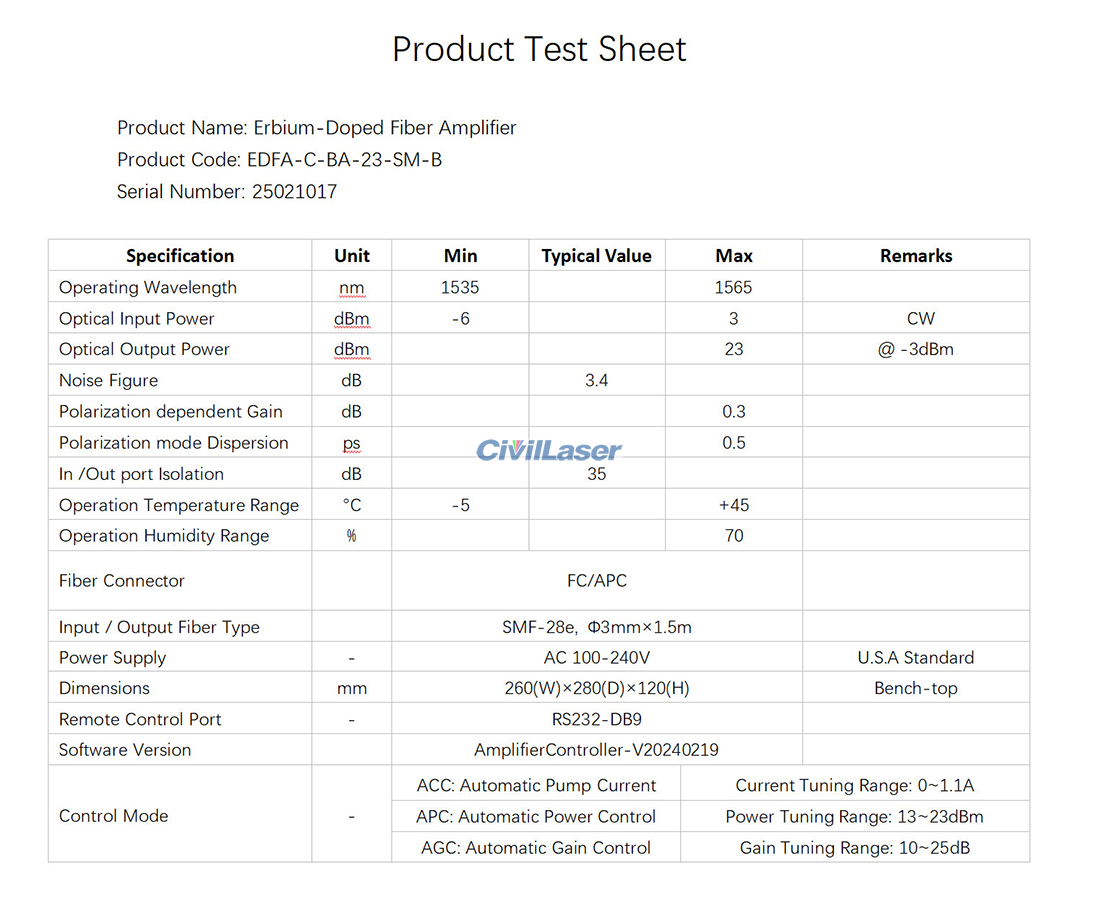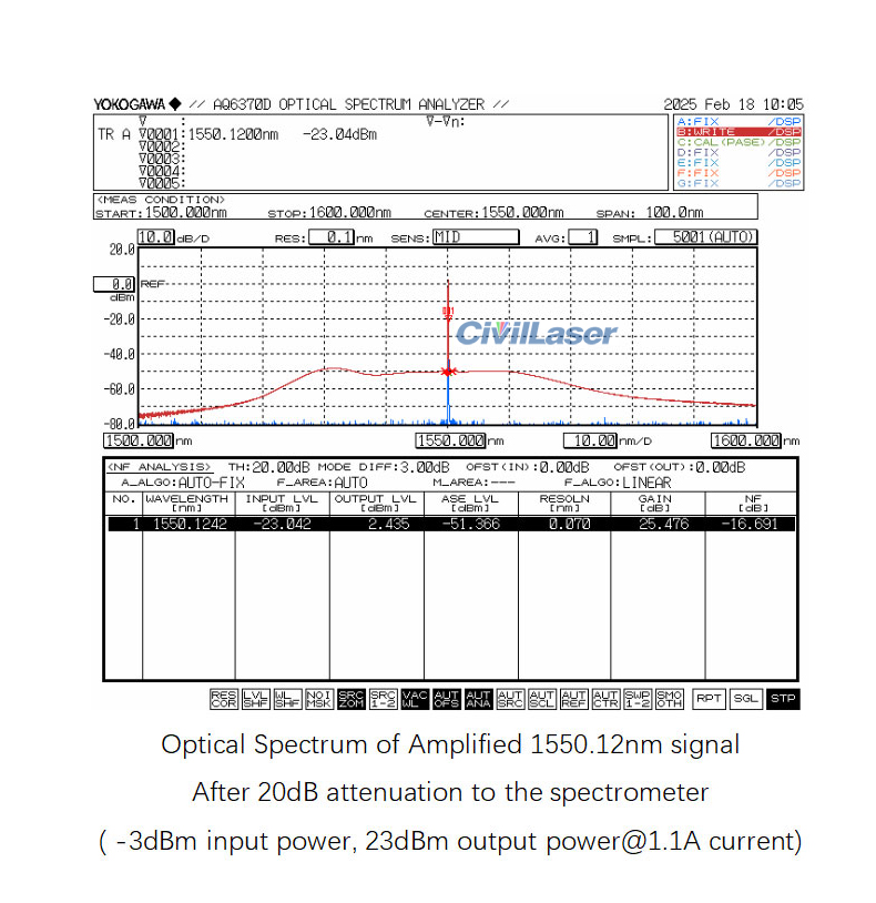 The test report of this C-band 23dBm fiber amplifier.