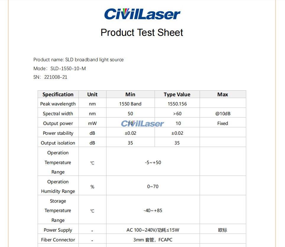 SLD broadband light source adopts super radiant semiconductor diode light-emitting chip, which outputs broadband spectrum with low coherence degree and high output optical power spectral density. The operating wavelength can be selected from O, S, C, L and other bands, suitable for optical OCT, optical fiber sensing applications.